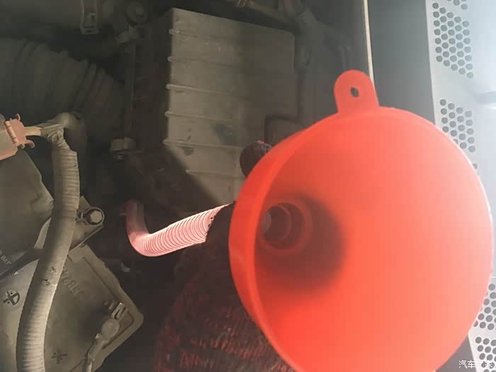 用加油漏斗,加油,这个是4L桶,手力不行的还得休息一下,