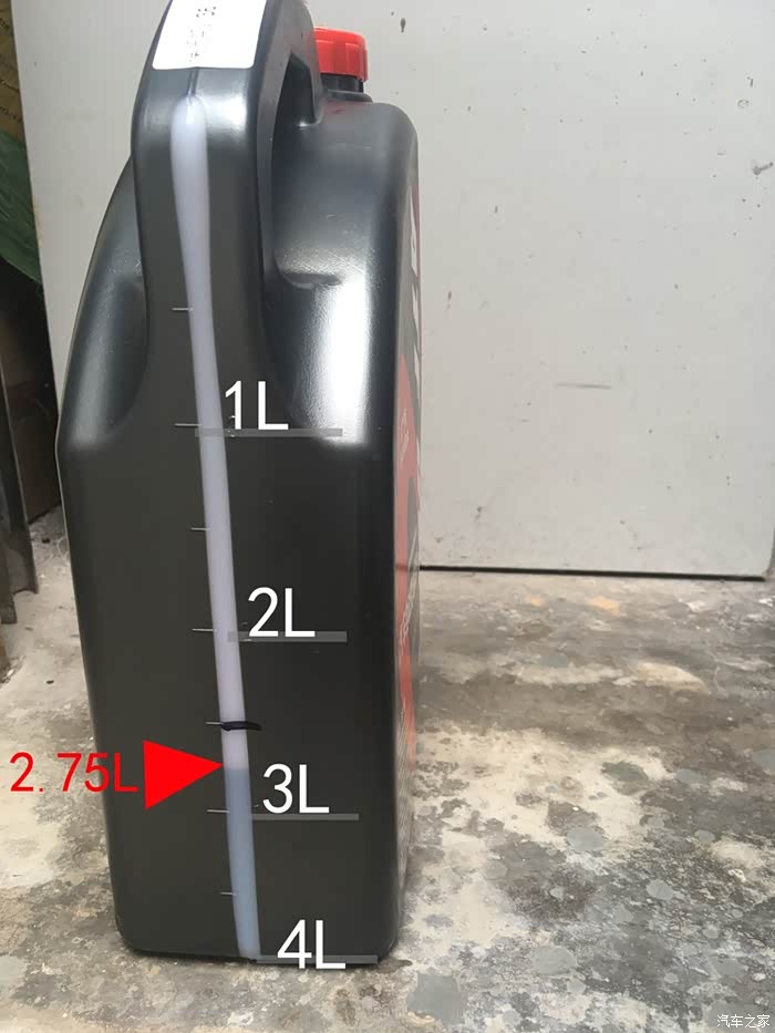 最后用量2.75L左右变速箱油。我用倒着的从上到下标记1-2-3-4L 方便读取,自己动手,关心的是用了多少油~!因为要倒多少油,可以提前划个线,不然抽来抽去很烦。