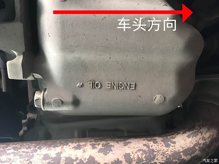 开始换油:首先要知道放油位置,位置很重要,在车底油底壳上的放油螺丝,上面有写engine oil 箭头,就是,看下图: