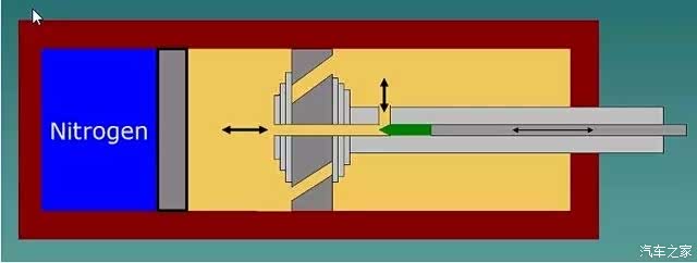 氮气避震是将油气避震中的空气换为纯净的氮气,并将氮气封闭,封闭的方式分为胶囊式和气罐活塞式;胶囊式是将氮气封装在一个橡胶质的胶囊里,放入套筒中;由于氮气本身比热大,物理稳定性好,因此压力可以达到1MPa以上,使性能提高10倍以上,同时由于胶囊的封闭,油不能混和,避免了产生油泡;胶囊式的缺点是由于橡胶隔热,氮气散热较慢,不适用于极端恶劣的使用环境:赛道。