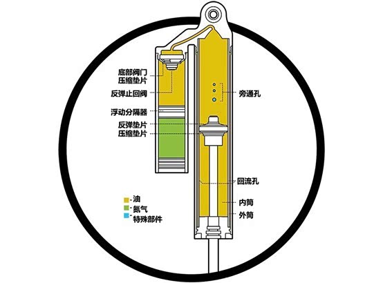 简单点说就是:就一个工作桶,当减震上下运动,油通过活塞上的特定压力的阀门流进流出,下部分充入高压的氮气,中间用浮动活塞(图中的O形圈)与油隔绝开。便可以利用氮气的膨胀和压缩,借助浮动活塞的上下运动来补偿因活塞杆的进出而引起的缸筒容积的变化。