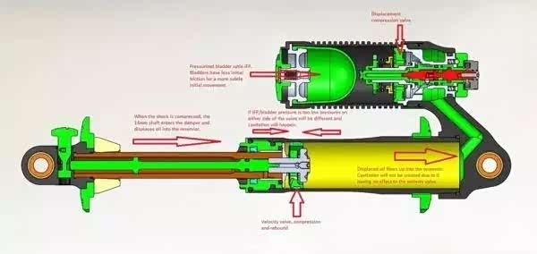 这个就是在单筒的基础上,在减震底部加一套底阀,通过底阀连接另外一个储油缸。当减震上下运动,油除了通过活塞上的特定压力的阀门流进流出,还通过也是特定压力的底阀在外储油缸之间流动,在外储油缸上部,一般充入低压的氮气,或者没压力的空气。