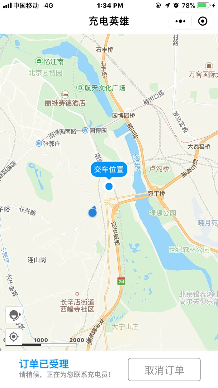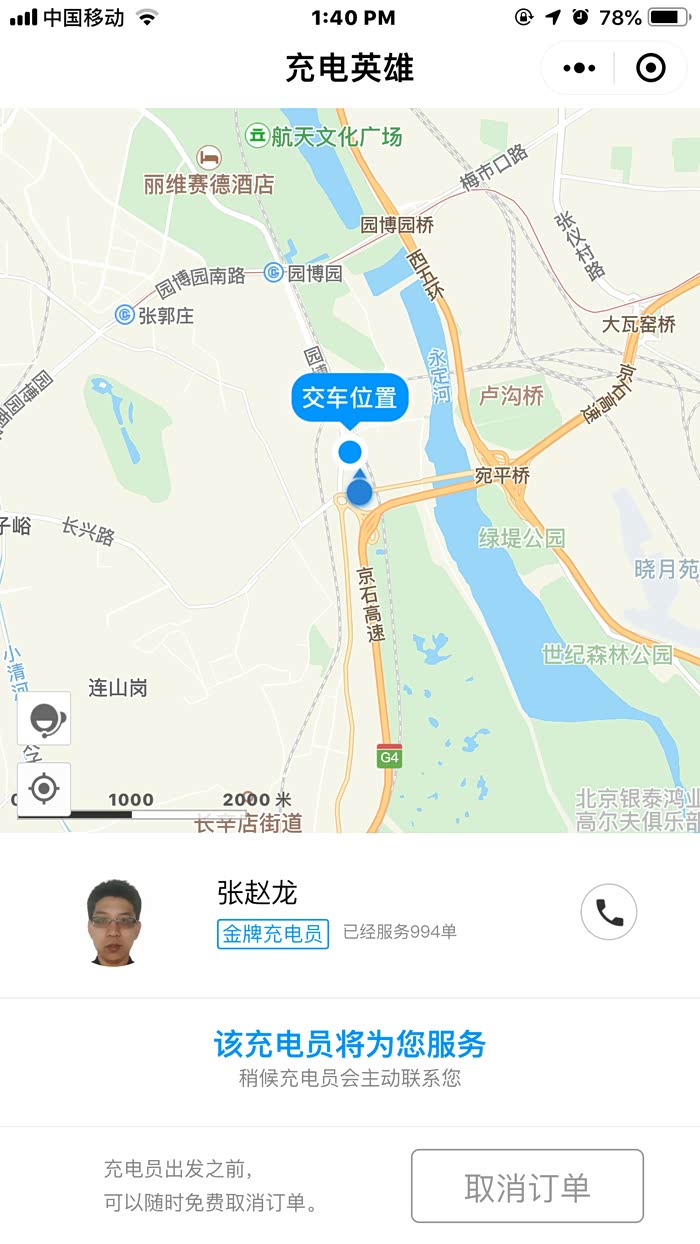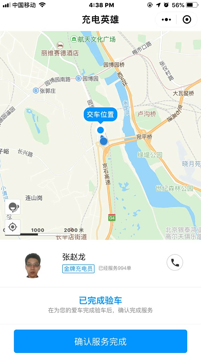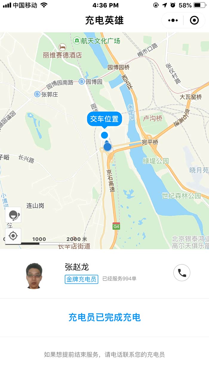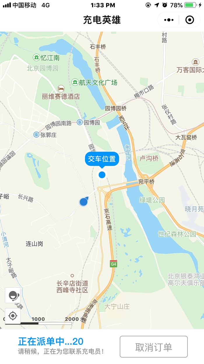 3分钟分配好充电员,并接到司机师傅电话“我是充电员,因为您所在的地区无直达公交车,我需要倒2趟才能到达,预计将在1个小时内到达,请您稍等”,后来经过交谈我才了解到,这个team在北京有十几个人,分布在北京的各个区域,他们分管北京的不同方位的充电订单