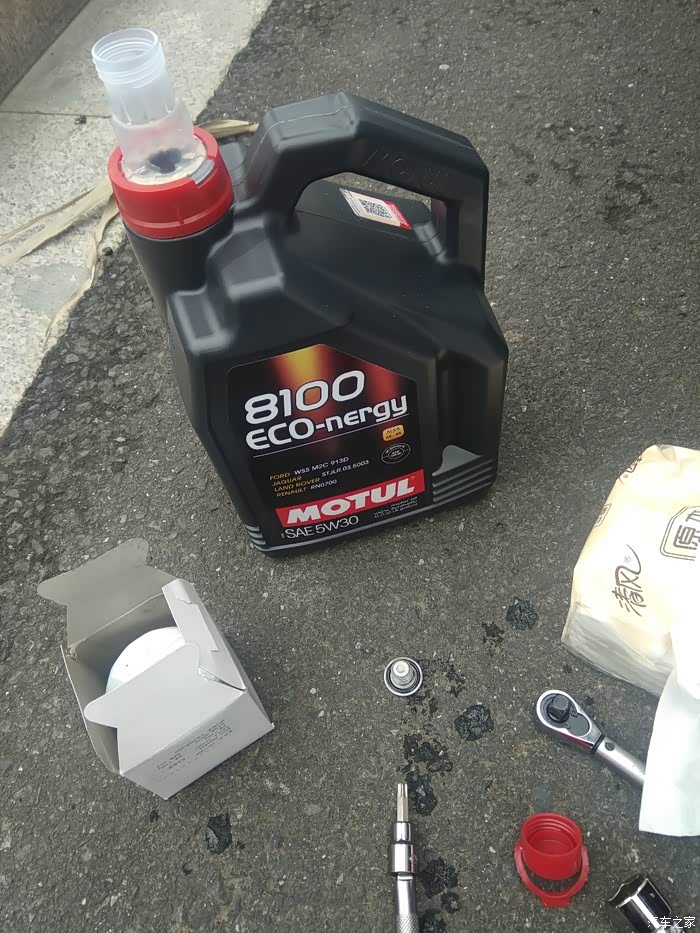 把放油螺丝和机滤装回去(螺丝24标准力矩,机滤20标准力矩)那纸抹布把油渍都擦干净,加注机油4.5升刚刚好,启动车辆轰几脚油门看看没有漏油就可以了。