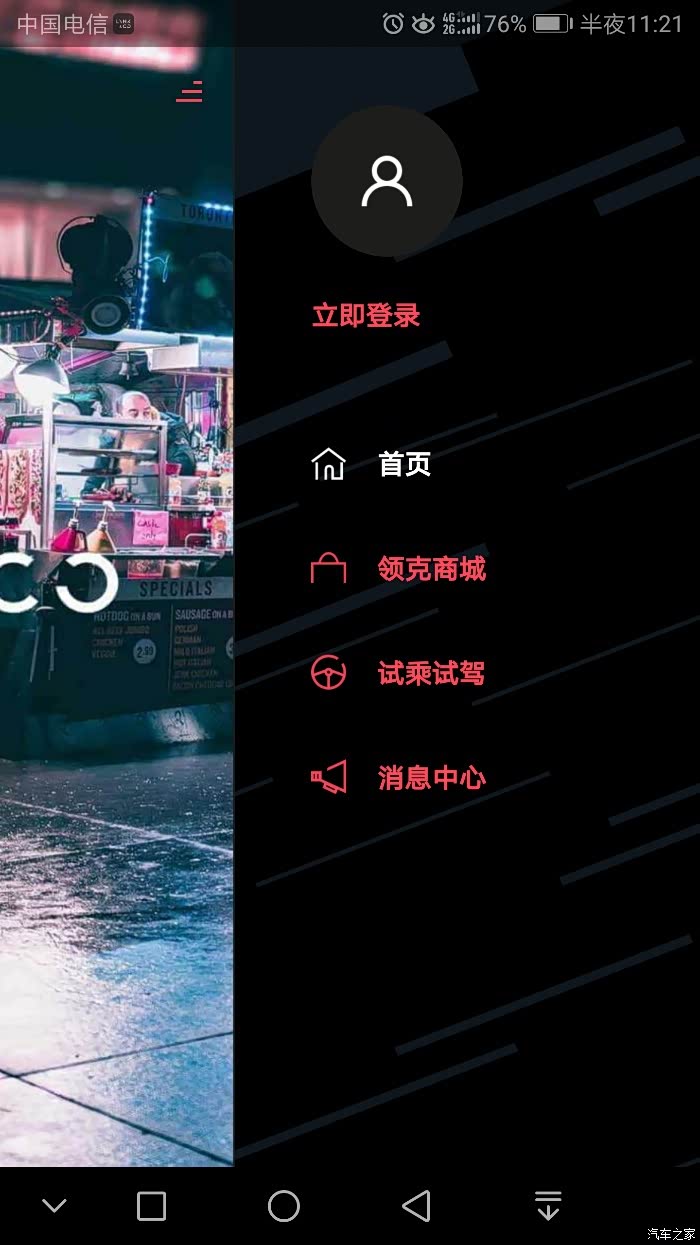 领克APP一点开,进入眼前的界面很酷,给人一种很时尚的感觉,也许这张图片在欧美某个街头。向右→滑动,可以看到立即登录,然后四大模块:首页、领克商城、试乘试驾、消息中心,如果登录之后,就是六大模块:首页、领克商城、试乘试驾、车联网、车主服务、消息中心。