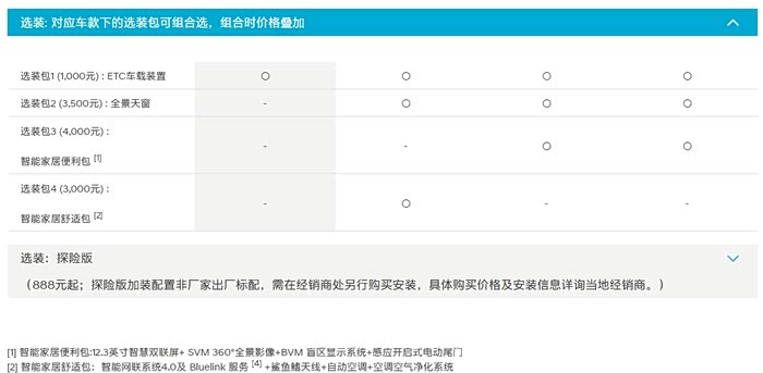 选装包4 (3,000元) :智能家居舒适包:智能网联系统4.0及 Bluelink 服务 [Bluelink 相关服务5年免费(含无限流量),仅限新车自购车日起一年内首次开通服务] +鲨鱼鳍天线+自动空调+空调空气净化系统