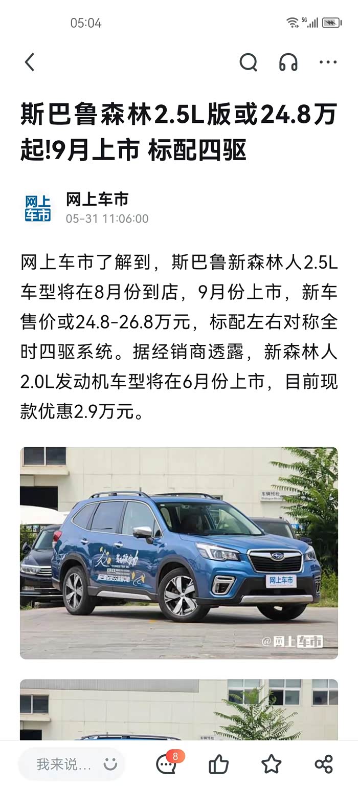 “网上车市了解到,斯巴鲁新森林人2.5L车型将在8月份到店,9月份上市,新车售价或24.8-26.8万元,标配左右对称全时四驱系统。据经销商透露,新森林人2.0L发动机车型将在6月份上市,目前现款优惠2.9万元。”不知道以上内容是否真的