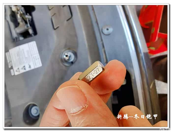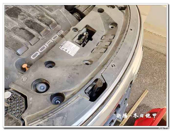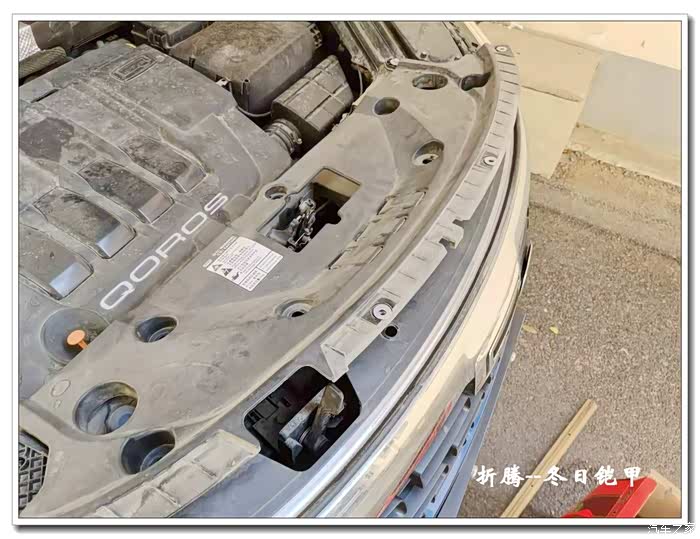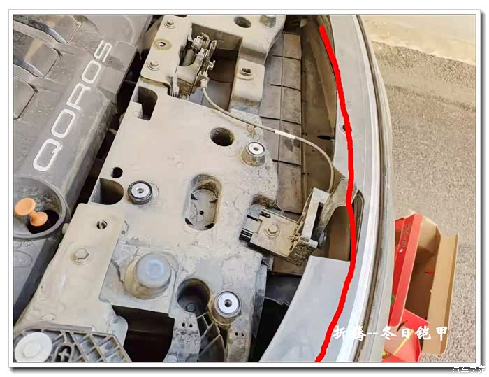 看到红色线那个缝没有,把整理好的纸板塞进去,上端超过挡风板,下端插进防撞泡沫盒保险杠的缝隙里面,大概能插进去4公分