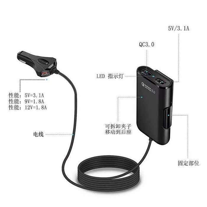 这个也必须推荐给大家,非常好用,性价比最好的东西,解决前后排手机充电问题,三个快充口,一个普通充电口。某西西上买的