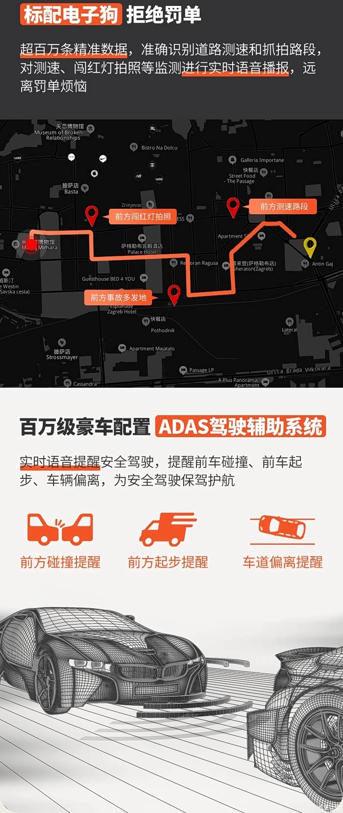 碰撞提醒、停车后前车启步提醒、高速上非常好用的车道偏离提醒,以及GPS路径与车速显示