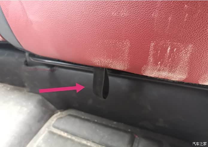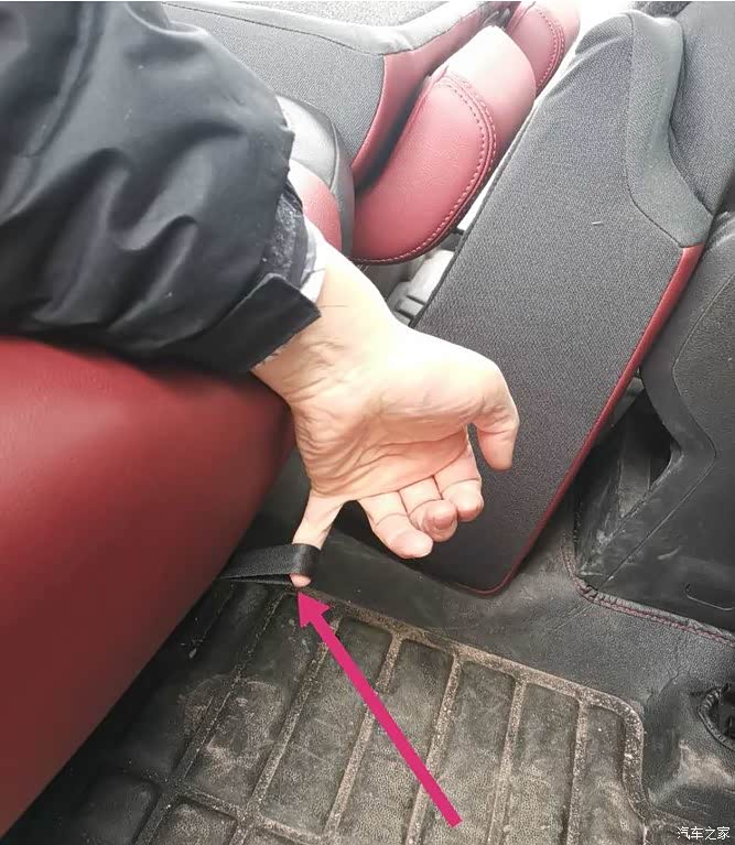 放倒坐垫以后,就是放倒椅子靠背,在靠背下端折叠处也有一个拉手,拽住它向外拉