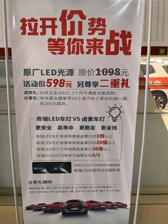 现看到4s店里奇瑞正在做活动,398元就可以换原装LE灯,太高兴了,下了订单,一个星期左右通知到货,师傅拿了灯现场看着装好,十多分钟就装好,总算解决我的大问题,给奇瑞和4s店的服务点赞。