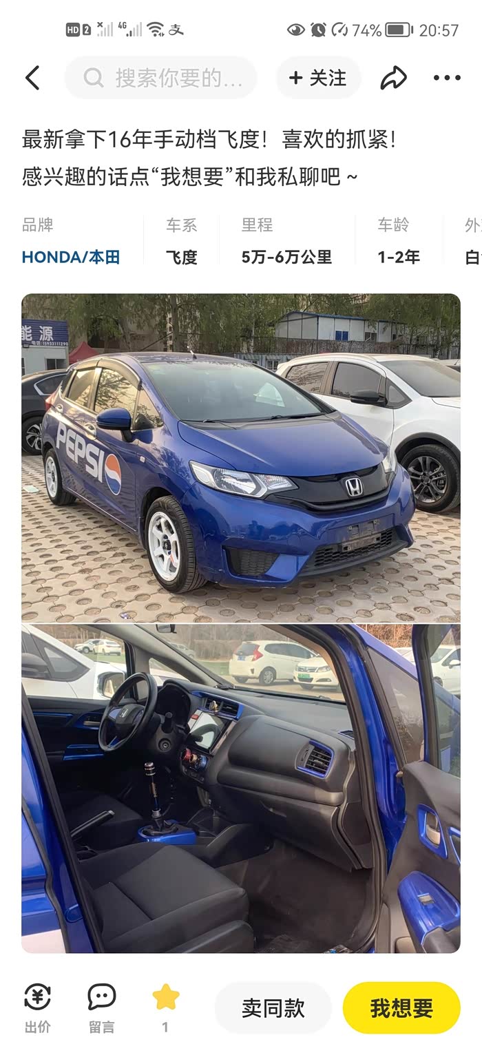 前阵把二手polo卖了。想换个车,找了一阵飞度没找到合适的。当时问过的有一个16年蓝色手动二手gk5,看起来是个人,在闲鱼上标价4w大 但一直问人家也没回复,10天前回复说卖了。今天突然刷到一辆车贩的车。细一看就是那辆 ,车贩子卖3w多。感觉挺便宜,约了明天看车,