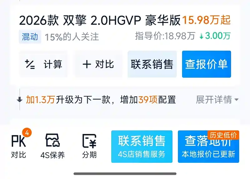 4S初步报价裸车只有3.5万优惠。有个政府补贴一万,置换补贴因为不是卖给4S只有2500。落地要16万。说到店可以谈。