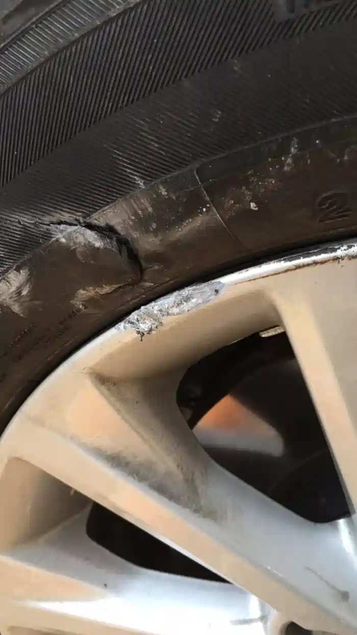 老婆二车道马路上调头,速度快了撞了路基,回来发现轮胎破了一小块,轮圈也有磨损。已换备胎至右前轮,现在这胎补补还能当备胎不?