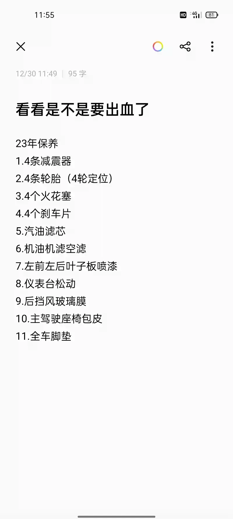 问 看看做完项目要多少钱?又得出血啊 删除 推荐精华 置顶 取消置顶 关闭回复 打开回复 推荐编辑 楼主禁言 移动帖子 重置头像 操作记录 tutu20121tutu 0浏览 · 2023-12-30 13:35· 发布于浙江 看看做完项目要多少钱?又得出血啊 举报 打开汽车之家 阅读体验更好 相关问题 更多 问马自达6,疑难杂症 0回答 问马六气门室盖垫换 0回答 问马自达6异响问题 0回答 问求马自达6大灯总成 0回答 问马自达6车身模块进水 0回答 问马六轿跑开空调漏水 0回答 全部回复 只看楼主 tutu20121tutu 楼主 关禁闭 已屏蔽 马自达6 哎,快过年了,马上给六子保养一次,去年年前大保养,今年又来一次, 2023-12-30 13:36 来自浙江 回复 沙发 举报 删除 取消删除 禁言 重置头像 共有条对话 > rzboy 关禁闭 已屏蔽 去年你做了啥?需要这么频繁吗?? 2023-12-30 16:27 来自上海 回复 板凳 屏蔽此人 举报 删除 取消删除 禁言 重置头像 共有条对话 > 医生007 关禁闭 已屏蔽 马自达6 估计得2000块钱 2024-01-02 10:07 来自河南 回复 地板 屏蔽此人 举报 删除 取消删除 禁言 重置头像 共有条对话 > 郑斌5430 关禁闭 已屏蔽 这么多公里数不整个电车 2024-01-03 02:03 来自吉林 回复 屏蔽此人 举报 删除 取消删除 禁言 重置头像 共有条对话 > 昵称昵称就是昵称 关禁闭 已屏蔽 12年的老马,现在8万7千公里。 2024-01-06 16:28 来自山西 回复 屏蔽此人 举报 删除 取消删除 禁言 重置头像 共有条对话 > 马66666663 关禁闭 已屏蔽 网上有说不要更换变速箱油,现在不知道咋办了。你换完之后有什么具体的感觉吗? 2024-03-31 10:50 来自福建 回复 屏蔽此人 举报 删除 取消删除 禁言 重置头像 共有条对话 > 西安车友剥壳 关禁闭 已屏蔽 马自达6 差不多全部下来3500含工时费左右了。 2024-06-27 13:25 来自陕西 回复 屏蔽此人 举报 删除 取消删除 禁言 重置头像 共有条对话 > 贝吉塔888 关禁闭 已屏蔽 我要申诉 该行程已被楼主删除 查看回帖内容查看操作记录 2024-12-03 12:48 来自江西 屏蔽此人 删除 取消删除 禁言 重置头像 共有条对话 > 还想在主楼增加内容?点击续写主楼内容 登录 参与更多互动 发表回复 打开App,查看更多评论 首 页 上一页 下一页 末 页 跳 转 取 消 还想在主楼增加内容?点击续写主楼内容 登录 参与更多互动 系统故障 发表回复 图片最多上传9张 微信好友 微信朋友圈 新浪微博 QQ好友 QQ空间 取消 相关推荐 加载中