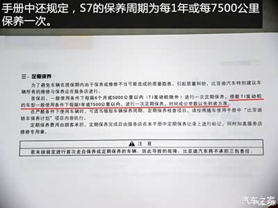 按照保养手册的建议,S7的常规保养周期为首次保养在3500±500公里时进行,之后每7500公里进行一次;燃油滤清器和空气滤清器每次保养都需更换;空调滤清器视使用情况清洁或更换;转向助力油和刹车油首次更换在26000公里时进行,之后每22500公里更换一次;火花塞每33500公里更换一次。机油;1.5TI车型每次需要更换4L机油,2.0TID车型每次更换6升机油。