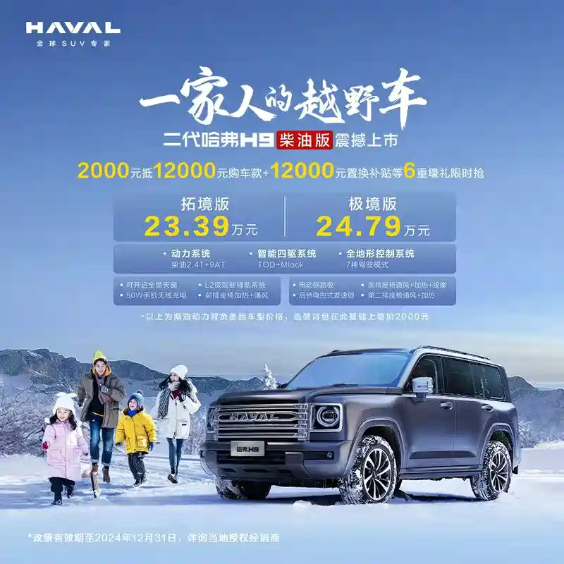 我是比较喜欢柴油车的,动力强不说,使用成本和维护成本都低。这次二代哈弗H9柴油版出来两个版本,拓境版23.39万元,极境版24.79万元,看区别是极境版有前排座椅按摩功能和后排座椅加热通风功能,扬声器好像也更好了一些,但价格差了1万来块。你们说买哪个更划算呢?