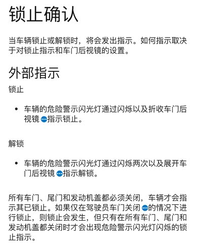 问 门没关好锁车没报警 删除 推荐精华 置顶 取消置顶 关闭回复 打开回复 推荐编辑 楼主禁言 移动帖子 重置头像 操作记录 ba3280 0浏览 · 2023-12-30 21:32· 发布于北京 智逸按锁车,再拉能开门,反光镜没折回,转了半天发现有个门没关紧,请问是不是应该车门没关好,一按锁车应该喇叭响一声呢? 举报 打开汽车之家 阅读体验更好 相关问题 更多 问24款防冻液位检查 0回答 问XC60电池问题 0回答 问沃尔沃xc60 0回答 问25款xc60变速箱 0回答 问新款Xc60怎么样? 0回答 问车机离线最近频繁发生 0回答 全部回复 只看楼主 蓝冰i 关禁闭 已屏蔽 沃尔沃S90 外部锁止指示是通过观察车灯状态或后视镜状态确认的。也可以在沃尔沃app中查看。 2023-12-30 22:14 来自广东 回复 沙发 屏蔽此人 举报 删除 取消删除 禁言 重置头像 共有条对话 > 腿毛很长的大叔 关禁闭 已屏蔽 沃尔沃没有响喇叭的这个功能,但是当你锁车门没关紧的时候,那个黄灯是在锁车时候不闪的,你可以判断 2023-12-31 10:27 来自湖北 回复 板凳 屏蔽此人 举报 删除 取消删除 禁言 重置头像 共有条对话 > Peter2022XC 关禁闭 已屏蔽 沃尔沃XC60 门没关好是锁不了车的。看后视镜有没有折叠就行了呀 2023-12-31 14:10 来自湖北 回复 地板 屏蔽此人 举报 删除 取消删除 禁言 重置头像 共有条对话 > mingzai834 关禁闭 已屏蔽 沃尔沃XC60 设置后视镜锁车折叠,然后看后视镜就好了。又一次就是没关好,然后后视镜没折叠 2023-12-31 15:32 来自北京 回复 屏蔽此人 举报 删除 取消删除 禁言 重置头像 共有条对话 > 新山与玫瑰 关禁闭 已屏蔽 雷克萨斯ES 原厂就没有说是锁车喇叭会响的。你说的那种都是后面加装的。都是一些比较低级的车才会有这样子的。你想想你开一个保时捷,锁车的时候叫一声是不是有点low 2023-12-31 20:23 回复 屏蔽此人 举报 删除 取消删除 禁言 重置头像 共有条对话 > 好运兵哥 关禁闭 已屏蔽 逍客 这么绅士的车你让他在大街上叫一声?叫一声? 2024-01-02 11:33 来自山东 回复 屏蔽此人 举报 删除 取消删除 禁言 重置头像 共有条对话 > metallink 关禁闭 已屏蔽 沃尔沃XC60 沃尔沃从来没有响喇叭的,耳朵不折叠,双闪不亮,都已经在提醒你没上锁,还要响一声,非得声光电全套流程你才能明白啊 2024-01-02 11:36 来自陕西 回复 屏蔽此人 举报 删除 取消删除 禁言 重置头像 共有条对话 > 老酒醉花生 关禁闭 已屏蔽 但如果锁车后从里面打开门你就会听到喇叭狂叫的声音了 2024-01-02 12:42 来自浙江 回复 屏蔽此人 举报 删除 取消删除 禁言 重置头像 共有条对话 > 还想在主楼增加内容?点击续写主楼内容 登录 参与更多互动 发表回复 打开App,查看更多评论 首 页 上一页 下一页 末 页 跳 转 取 消 还想在主楼增加内容?点击续写主楼内容 登录 参与更多互动 系统故障 发表回复 图片最多上传9张 微信好友 微信朋友圈 新浪微博 QQ好友 QQ空间 取消 相关推荐 加载中