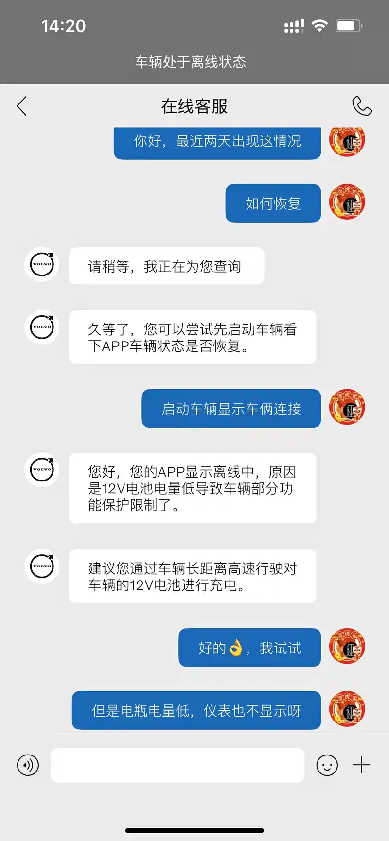 问 沃尔沃APP管家问题 删除 推荐精华 置顶 取消置顶 关闭回复 打开回复 推荐编辑 楼主禁言 移动帖子 重置头像 操作记录 四海淘宛 0浏览 · 2025-01-14 14:25· 发布于江苏 最近出现车辆离线,试了重新卸载安装不行,重启车机也不行,电瓶显示满电状态,电压没测,不知道其它车友有遇到情况如何解决吗,启动车辆后没啥问题,显示车辆连接使用中。就是熄火离开不久就离线了 举报 打开汽车之家 阅读体验更好 相关问题 更多 问路边停车熄火 0回答 问XC60原厂下护板 0回答 问关于全景影像 0回答 问更换蒸发箱后出现异响 0回答 问XC60方向盘异响 0回答 问请问各位车友 0回答 全部回复 只看楼主 雨后阳光880315 关禁闭 已屏蔽 凯迪拉克XT5 车辆熄火后不久就离线,可能是车机系统或通信模块故障,可尝试更新车机系统软件。 2025-01-14 14:41 来自山东 回复 沙发 屏蔽此人 举报 删除 取消删除 禁言 重置头像 共有条对话 > 22款XC60窝窝头 关禁闭 已屏蔽 沃尔沃XC60 我是升级到3.3.16后也这样 2025-01-14 15:15 来自上海 回复 板凳 屏蔽此人 举报 删除 取消删除 禁言 重置头像 共有条对话 > 22款XC60窝窝头 关禁闭 已屏蔽 沃尔沃XC60 我最近钥匙反应有些迟钝,准备换电池。不知道跟这个情况有没有 2025-01-14 15:18 来自上海 回复 地板 屏蔽此人 举报 删除 取消删除 禁言 重置头像 共有条对话 > 蓝冰i 关禁闭 已屏蔽 沃尔沃S90 是一直离线,还是只是部分位置离线?如果是后者,不排除是特定位置联通LTE信号不佳;如果一直不行,考虑升级到3.3.16试试。我没升级前AQI不显示、空气净化功能不显示。升级后就都正常了。 2025-01-14 15:31 来自广东 回复 屏蔽此人 举报 删除 取消删除 禁言 重置头像 共有条对话 > 四海淘宛 楼主 关禁闭 已屏蔽 沃尔沃XC60 现在好了,也不知道什么原因,我按住除霜大约25秒,重启网络,有3-4小时了现在没掉线,到明早再看看,希望没问题😊 2025-01-14 21:40 来自江苏 回复 举报 删除 取消删除 禁言 重置头像 共有条对话 > 北京车友沃行我速 关禁闭 已屏蔽 我的也是这样的情况,而且现在APP还得重新用两个钥匙同时在车里重新登录 2025-01-15 13:40 来自北京 回复 屏蔽此人 举报 删除 取消删除 禁言 重置头像 共有条对话 > 广袤Sky 关禁闭 已屏蔽 楼主说:电瓶显示满电状态。 请问这个是从哪里看到呢呢? 2025-01-15 13:59 来自北京 回复 屏蔽此人 举报 删除 取消删除 禁言 重置头像 共有条对话 > 还想在主楼增加内容?点击续写主楼内容 登录 参与更多互动 发表回复 打开App,查看更多评论 首 页 上一页 下一页 末 页 跳 转 取 消 还想在主楼增加内容?点击续写主楼内容 登录 参与更多互动 系统故障 发表回复 图片最多上传9张 微信好友 微信朋友圈 新浪微博 QQ好友 QQ空间 取消 相关推荐 加载中