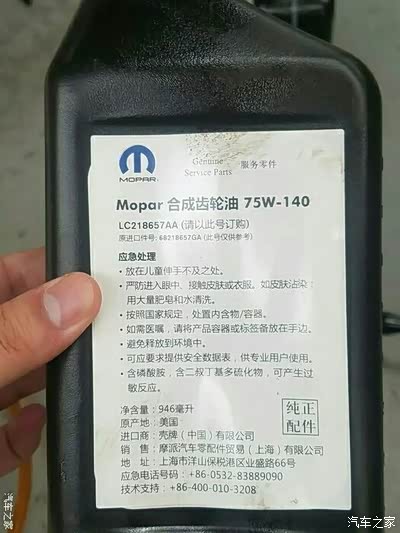 原车使用Mopar 75W-140齿轮油。换一次1L就够了,好像是100多块。