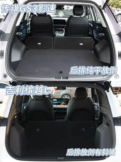 空间上,影速的轴距是2650mm,比缤越L的2600mm多出50mm,后排坐满的时候,能感觉到明显差距,影速的地台是全平的,而缤越有凸起,所以腿部空间的自由上,是影速更好一点,后备厢容量差距不大,但是影速的后排座椅能放全平,缤越做不到,所以空间延展性和利用率上,也是影速小胜一点。