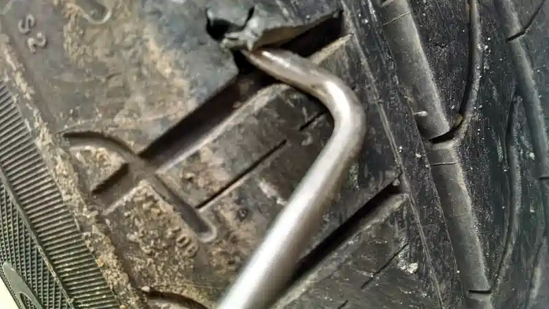 如果已经扎透,漏气 需要处理,进行补漏,可以考虑把用做后轮,城市行车没什么问题,但如果出远门上高速,车速特别开的情况下建议更换,您可以把半尺寸轮胎放在家里把这个补好放后被箱,应急用。