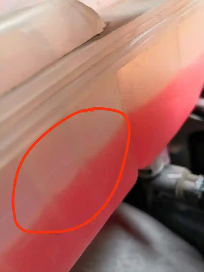 观致的冷却液一般都是加到膨胀壶的上面接缝处(图上所示),观致只有MIN(下限)刻度,所以一般最低不能到那个刻度,楼主所示的图已经低于下限,冷却液是肯定会报警的,有时候哪怕刚到在MIN也会报警,因为有坡度问题。所以个人的建议是加到我上图所标的位置即可,冷却液的正常损耗是极小的,加一次基本可以用2-3年(考虑变质更换)