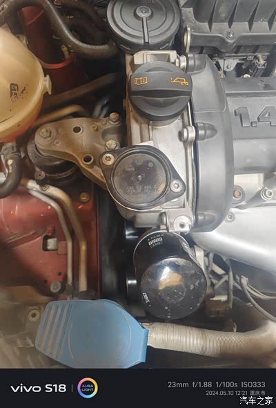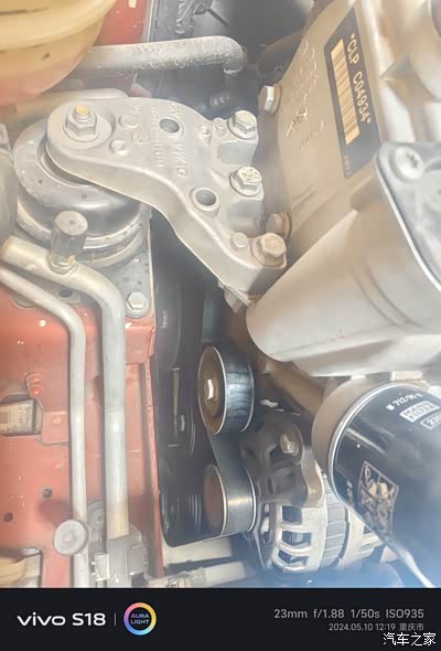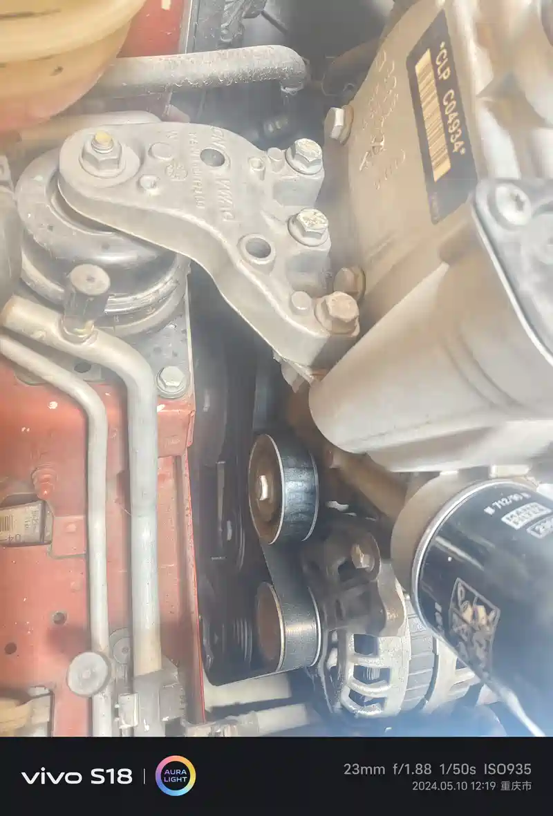 这个皮带是发电机皮带,带着空调压缩机,发电机,水泵。正时链条在旁边盖子里面,下面带俩螺丝的是油气分离器,拧下螺丝往外拔的时候两边匀力拔,里面有2道密封胶圈,第一次拔可能会紧点。