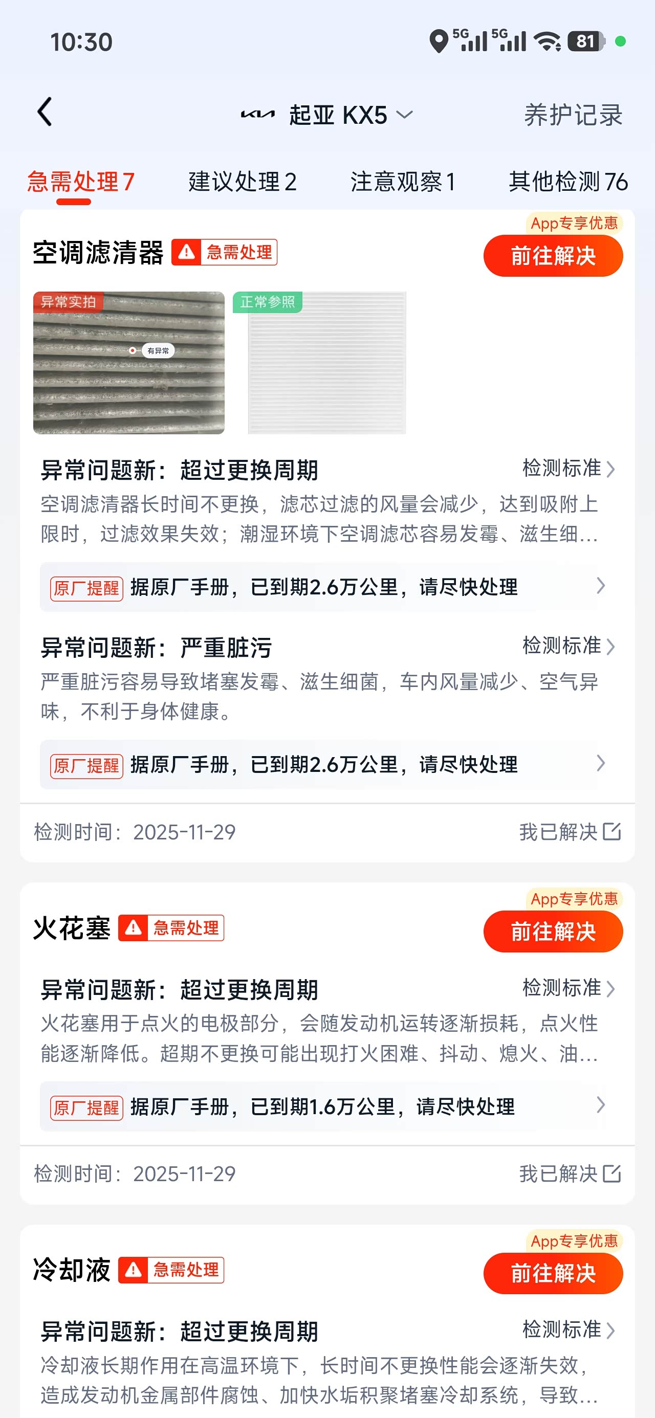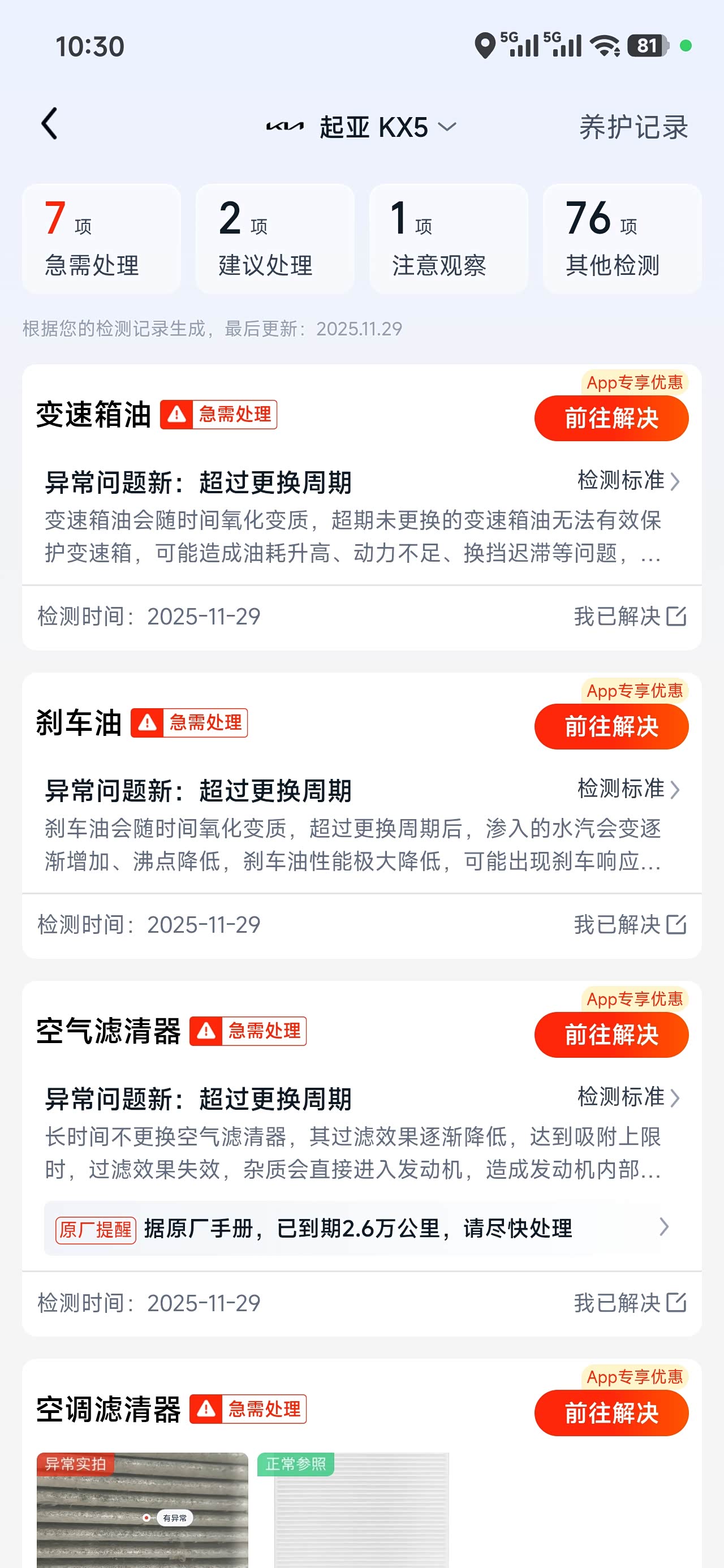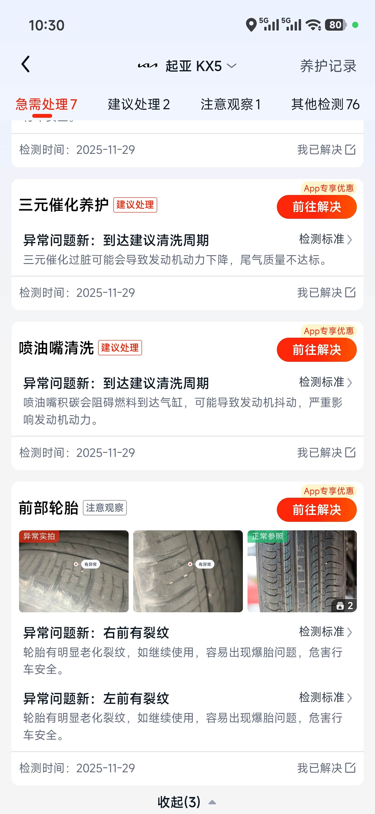 他的检查写是这样写的,主要还是看自己的实际使用情况来决定。有的人开十多W公里都不用换刹车片,我开了8W刹车片就磨到报警声了。轮胎也是8年了虽然只有8W公里,外表只是一些裂痕,但架不住老化了呀。那天上了换胎那个机器转圈的时候就掉橡胶。也不知道别人咋开的。都不用刹车的吗。