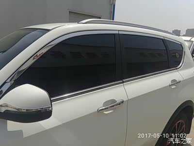 原车只有下窗亮条,我又修饰了一下,上面也增加上了,倒车镜上的亮条,还有不锈钢门把手,瞬间高大尚啊
