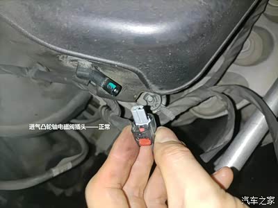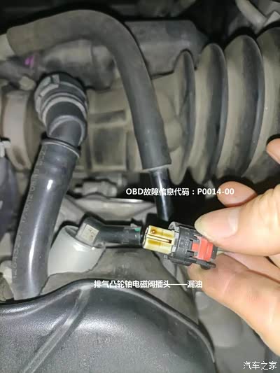17款XL,发动机故障灯亮,OBD读取的故障代码是P0014-00(排气凸轮轴位置系统性能 ),然后把排气凸轮轴电磁阀插头拔出来,发现插头处漏油。同时把进气凸轮轴电磁阀插头也拔出来,插头是干净的