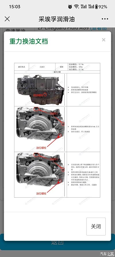 问 请问9AT换油步骤 删除 推荐精华 置顶 取消置顶 关闭回复 打开回复 推荐编辑 楼主禁言 移动帖子 重置头像 操作记录 北京车友7923388 0浏览 · 2024-09-05 17:55· 发布于北京 最不舍得删的爱车照片 如题,是放油后加到观察口滴油,然后再加半升油吗?谢谢! 举报 打开汽车之家 阅读体验更好 相关问题 更多 问探界者档把处异响 0回答 问多媒体物理按键失效 0回答 问探界者后雨刮胶条坏了 0回答 问车内出现汽油味 0回答 问车辆年检问题求助 0回答 问探界者通信类故障 0回答 优质解答 坛友老P 关禁闭 已屏蔽 2024-09-05 20:26 来自北京 回复 屏蔽此人 举报 删除 取消删除 禁言 重置头像 共有条对话 > 全部回复 只看楼主 西土瓦甄 关禁闭 已屏蔽 探界者 要是重力更换,最好找一个带刻度的容器接废油,这样接出来多少,再加入多少,计量准确。要是循环机更换,属于等量交换,不用考虑加油量的问题。 2024-09-05 18:45 来自河北 回复 沙发 屏蔽此人 举报 删除 取消删除 禁言 重置头像 共有条对话 > 坛友老P 关禁闭 已屏蔽 2024-09-05 20:26 来自北京 回复 板凳 屏蔽此人 举报 删除 取消删除 禁言 重置头像 共有条对话 > H心在驿动 关禁闭 已屏蔽 探界者 去网上搜探界者的厂方电子版维修手册下载后看其中的9AT换波箱油要求吧,检查滴油量时是要看在特定油温范围内的,用汽车检测仪插OBD看即时的波箱油温,群里换油的只知道讨论是循环机换还是重力换好,都不知道最后的检查换油量是须要在厂方维修手册中要求的规定油温范围内才是合适的 2024-09-05 20:44 来自广西 回复 地板 屏蔽此人 举报 删除 取消删除 禁言 重置头像 共有条对话 > Trexc 关禁闭 已屏蔽 你这5升,我上次重力将近6升,工人就不知道溢油孔是个啥玩意儿,糊里糊涂的开吧,反正变速箱挺平顺的。 2024-09-06 08:04 来自河北 回复 屏蔽此人 举报 删除 取消删除 禁言 重置头像 共有条对话 > 王山而888 关禁闭 已屏蔽 沃兰多 重力换还是用容器等量交换靠谱点,哪怕用废机油桶测量(桶上有刻度)。看溢油孔也不太靠谱,毕竟车升起来不一定是平的 2024-09-06 09:47 来自江苏 回复 屏蔽此人 举报 删除 取消删除 禁言 重置头像 共有条对话 > 北京车友7923388 楼主 关禁闭 已屏蔽 各位,查到维修手册了,的确加多了。滴油口漏油后不应该多加半升。 2024-09-06 11:40 来自北京 回复 举报 删除 取消删除 禁言 重置头像 共有条对话 > meder47 关禁闭 已屏蔽 探界者 这车内置滤芯推荐重力换,我是4万换的,5万换机油时候又换了一次,这样比较干净。我当地没4S了,异地4S邮寄的油,5L330元,去我大众4S哥们给换的。其实5升是不够的,自己人换放的时间长,大概等了快1小时,最后加进去5.5L左右,油不够还去别克买了一桶。换油过程说下,去外面跑一跑,因为没有通用电脑只能看水温,水温最高上架放油,尽可能放时间久些干净。加油到溢流口出油(在变速箱左侧半轴旁边),拧上溢流口螺栓,汽车打火,各个档位换一下,熄火后打开溢流口继续加油,到溢流口滴油拧上溢流口,启动车辆怠速到水温最高后再等会,有条件可以测量变速箱壳体温度,温度上来后再检查溢流口,少了补多了等溢流口变成滴油合格,检查各螺栓、加油口等,完工。 2024-09-06 13:20 来自黑龙江 回复 屏蔽此人 举报 删除 取消删除 禁言 重置头像 共有条对话 > 豫见你的美900823 关禁闭 已屏蔽 这车重力换放油5.5升加6升妥妥的 2024-09-06 13:28 来自江苏 回复 屏蔽此人 举报 删除 取消删除 禁言 重置头像 共有条对话 > 昆明车友5199224 关禁闭 已屏蔽 5万公里重力换的,旧油放光后加注新油,加到溢出。然后着车在架子上跑个两三分钟,再松开溢油口的螺丝,要是没有油溢出,就补充到溢出为止。这样就OK了。 2024-09-10 15:52 来自云南 回复 屏蔽此人 举报 删除 取消删除 禁言 重置头像 共有条对话 > 广州车友7026775 关禁闭 已屏蔽 直接去4s换,几百块 2024-09-12 11:39 来自广东 回复 屏蔽此人 举报 删除 取消删除 禁言 重置头像 共有条对话 > 还想在主楼增加内容?点击续写主楼内容 登录 参与更多互动 发表回复 打开App,查看更多评论 首 页 上一页 下一页 末 页 跳 转 取 消 还想在主楼增加内容?点击续写主楼内容 登录 参与更多互动 系统故障 发表回复 图片最多上传9张 微信好友 微信朋友圈 新浪微博 QQ好友 QQ空间 取消 相关推荐 加载中