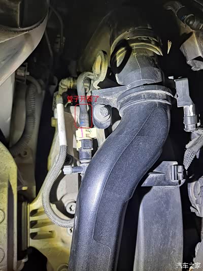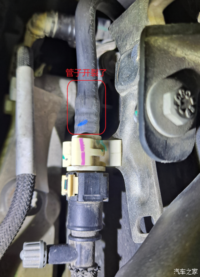 发动机舱一处管子老化开裂,在发动机左侧