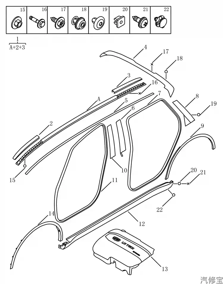 配图是嘉际行李架的配件图,图中可以看出嘉际的行李架是通过15(螺母)和16(螺栓)固定的,并不是只用胶粘上去的装饰条,具有一定承重能力。但考虑嘉际较大面积的全景天窗,个人认为行李架的承重不应超过25kg。以上纯属个人意见,一切还是以使用手册为准。
