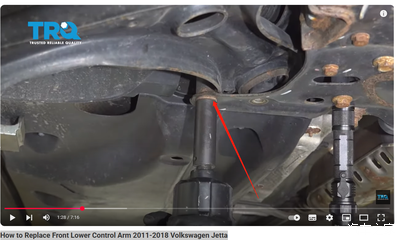2. 看了一个老外的视频(How to Replace Front Lower Control Arm 2011-2018 Volkswagen Jetta),他好像没有松传动轴螺栓,而是,松了副车架上的箭头处的螺母(扭矩 70 + 90度)