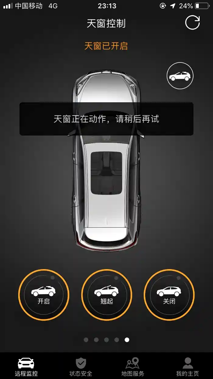 昨天使用远程开关天窗都是完全正常的,今天打开app看到天窗显示状态是开启,实际是关闭的,(锁车状态)。然后在app上操作天窗没有任何作用,还显示正在动作,如图,不知道啥情况,需要去4s看看?