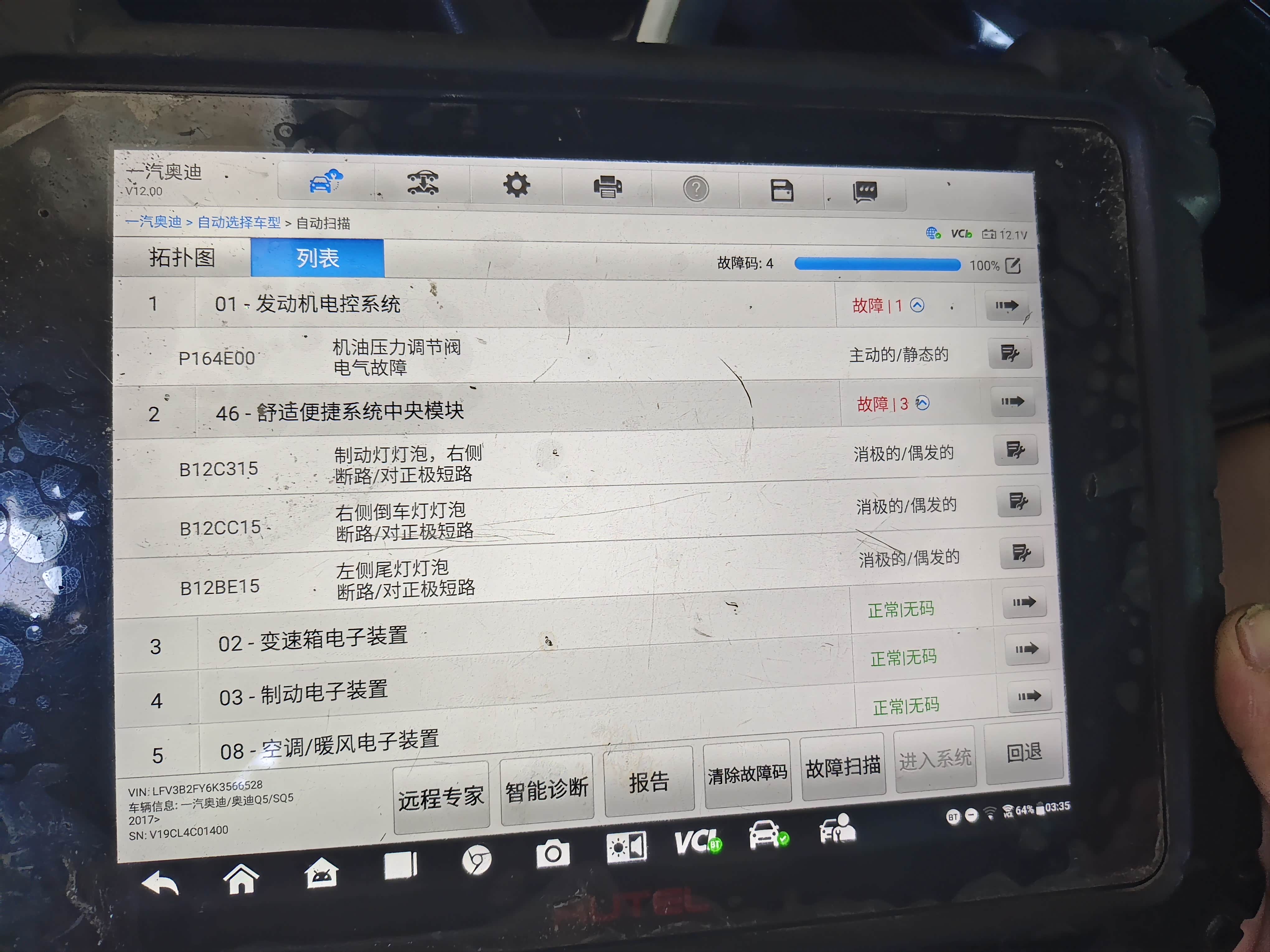 看故障码显示右侧尾灯和倒车灯都报短路,左侧尾灯也报断路,保险没坏的话很可能是尾灯控制模块挂了。Q5L这车尾灯是LED的,先检查后备箱左侧的J393舒适模块有没有进水,再测下尾灯插头有没有12V电。模块坏了得换,外面修800左右。