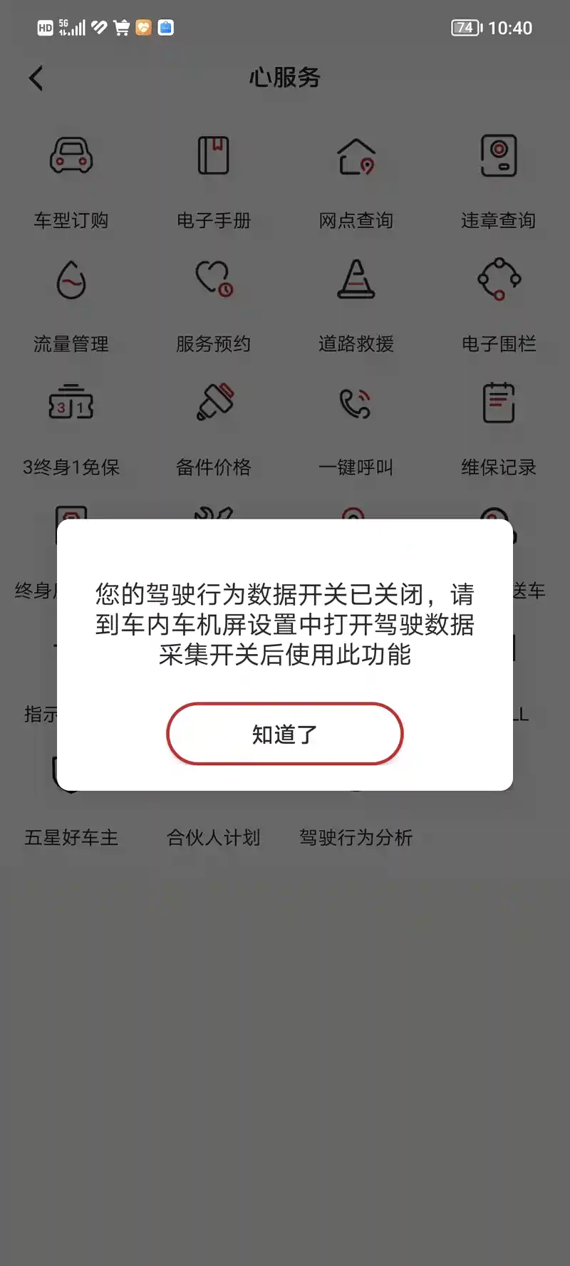 问 驾驶行为分析打不开了 删除 推荐精华 置顶 取消置顶 关闭回复 打开回复 推荐编辑 楼主禁言 移动帖子 重置头像 操作记录 C2730 0浏览 · 2022-12-12 16:46· 发布于广东 也不知道怎么回事,昨天发现驾驶分析打不开了,一直提醒我去打开数据采集开关,但车机根本就没有这个东西,问销售也不懂,售后又还没回复,有懂的吗 举报 打开汽车之家 阅读体验更好 相关问题 更多 问请大神支招 0回答 问门槛灯 0回答 问保养 0回答 问红旗hs5轻微跑偏 0回答 问22款 0回答 问关于天窗使用 0回答 全部回复 只看楼主 hero_xjq 关禁闭 已屏蔽 红旗HS5 今天App后台网络异常 2022-12-12 20:30 来自广东 回复 沙发 屏蔽此人 举报 删除 取消删除 禁言 重置头像 共有条对话 > 长大才变乖 关禁闭 已屏蔽 雷克萨斯ES 异常。 2022-12-12 22:21 来自湖北 回复 板凳 屏蔽此人 举报 删除 取消删除 禁言 重置头像 共有条对话 > sun_y_g 关禁闭 已屏蔽 红旗HS5 我这正常呀 2022-12-13 05:50 来自内蒙古 回复 地板 屏蔽此人 举报 删除 取消删除 禁言 重置头像 共有条对话 > 还想在主楼增加内容?点击续写主楼内容 登录 参与更多互动 发表回复 打开App,查看更多评论 首 页 上一页 下一页 末 页 跳 转 取 消 还想在主楼增加内容?点击续写主楼内容 登录 参与更多互动 系统故障 发表回复 图片最多上传9张 微信好友 微信朋友圈 新浪微博 QQ好友 QQ空间 取消 相关推荐 加载中