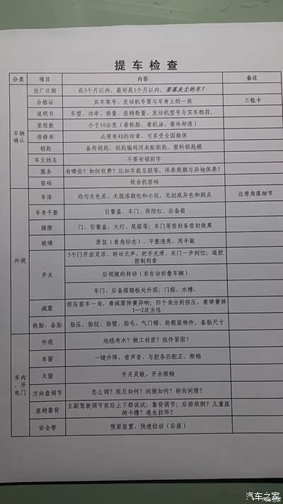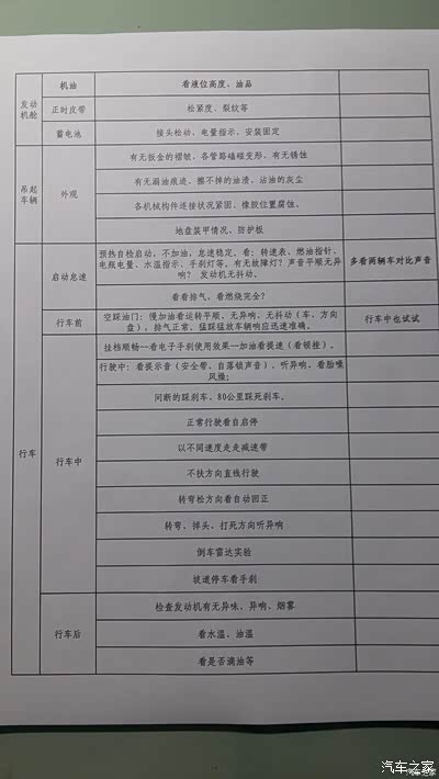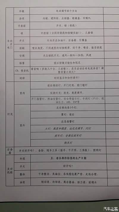 问 验车注意事项 删除 推荐精华 置顶 取消置顶 关闭回复 打开回复 推荐编辑 楼主禁言 移动帖子 重置头像 操作记录 南京车友1924948 0浏览 · 2016-06-14 21:11 这几天就要去验车了,请问下有啥特别要注意事项么?网上理论教程一大堆感觉好多,是不是验车也就是走个过场? 举报 打开汽车之家 阅读体验更好 相关问题 更多 问空调出风口镀铬起皮 0回答 问轮胎换那个品牌好 0回答 问我想问一下各位大侠, 0回答 问这个异响严重不 0回答 问加92好还是95好? 0回答 问车辆怠速时有抖动 0回答 优质解答 吉和街 关禁闭 已屏蔽 探岳 2016-06-14 21:16 回复 屏蔽此人 举报 删除 取消删除 禁言 重置头像 共有条对话 > 全部回复 只看楼主 黑树先生 关禁闭 已屏蔽 注意事项1:车身贴画任何车贴或车标,即便面积再小,也是不允许通过验车的,不过也有特例,“实习”标等经过公安机关备案审批的合法车贴是被允许的。如果你是新买的车也不要马上贴上自己喜欢的帖纸,需要在上牌完成之后再贴。注意事项2:车身太脏车辆过脏会对外观和底盘部分的检测造成影响,并且验车需要照相,所以太脏了检测人员会不给照像,因此也就不能通过外观检验了,这点同样适用于新车上牌。注意事项3:保险是否到期不少朋友在保险到期之前就延续了新一年的保险,可能验车时老保险并没有过期,新保险尚未生效,此时一定要携带仍在有效期内的保单原件,也就是老的保单来验车,否则未生效的保险不能通过检测,当然这些仅针对交强险,交强险是验车必备的,商业险暂时可以不用。注意事项4:三角窗贴膜按照规定,玻璃贴膜是不影响验车的,不过前排车窗三角窗夹角处不能贴膜,这里需要留出良好的透光性为驾驶员观察两侧后视镜提供便利,因此此处一旦贴膜,将不能通过验车。如果车辆没有三角窗,贴模时也要预留出足够的面积。贴膜这个事儿也是需要在新车上牌之后再贴。注意事项5:轮胎尺寸改变更换的轮胎一定要与原车的尺寸型号完全相同,否则即便轮毂样式不变,型号出现变化,也不能通过验车,我们的公车哈弗就曾遭遇过这样的事情,更换轮胎时由于疏忽,轮胎宽度与原车不同,其余参数完全一致,然而未能通过验车。注意事项6:外观与照片不符只要与行驶本照片不符,则视为外观改装。如果你车身上的车身标示脱落了不用担心验车过不了,因为相关规定里明确标示,车身标示因自然脱落等原因不会影响验车,但只要不增加标识即可。注意事项7:违章是否处理完毕不少朋友再验车之前都会准备一下所需材料,此时精力都集中在了车辆身份资料上,往往忽略了未处理的违章问题。按照规定,违章没有及时清除的,虽然可以通过外观,尾气等方面的检测,但是最终的“检”字标要等处理完违章才能领取。注意事项8:外观有损伤日常用车小刮小蹭在所难免,很多车主由于种种原因小伤干脆也不修了,大多数情况这些并不影响验车,不过一些比较严重的伤痕有可能增加外观通过的难度,建议明显的伤痕还是及时修复后再去验车。 2016-06-14 21:13 回复 沙发 屏蔽此人 举报 删除 取消删除 禁言 重置头像 共有条对话 > lxxq520 关禁闭 已屏蔽 (一)检查汽车与其铭牌是否相符:发动机号、车架号、产品合格证及出厂日期,这些都是标明一辆车“合法身份”的特征。合格证上的号码要与车上的发动机号、车架号一致。从出厂日期上判别其是否为积压车,了解车辆从产到销的时间。另外,车型、功率、座椅数量、发动机等均要求说明书与实物一致。如出现不符,不但花了冤枉钱,而且今后也无法办理验车上牌手续。(二)若是进口车,则应查验进口单据:在购买进口车时,应仔细查验进口货物证明以及关税、增值税等各项应交的税单。否则,买到了手续不全的进口车,一是质量无法保证,二来在办理牌照时会因进口手续不全而无法上牌。 二、提取新车时需仔细检查的项目(一)验车前带齐发票、出厂证、保险单、保修单、说明书。查对排汽量、出厂年月、车架号、发动机号、里程表。(二)发动机部分 1.水箱和副水箱冷却水液面及水管是否泄漏。 2.引擎机油液面,油质。 3.发电机,压缩机等皮带松紧度。 4.电瓶电解液面,蓄电量。 5.刹车总泵油液面及是否泄漏。 6.雨刷洗涤壶液面管路是否泄漏及喷水角度。 7.各汽油管夹及各软管有否泄漏。 8.电线接头插入及定位情况。 9.变速箱油面。 10.空调制冷剂是否缺少,干燥罐及接头是否泄漏。 11.电动风扇(冷气及水箱)作动。 12.发动车,听怠速时发动机运转声音是否均匀、平稳。 13.启动发动机,在冷启动时注意转速表指针的变化。正常情况下指针应打到1500转左右,然后正常平顺的滑落至750-800转。然后观察各种仪表及报警装置工作是否正常,当水温和机油压力正常时。要通过对发动机的声音和反映进行检查,首先听待速的声音,应该是平稳而且连续的,不应该有金属敲击声和其它异响,下车观察排气管排烟是否正常,将手伸到排气口感觉一下排气是否连续,正常的应该使掌心有点潮湿但不应有机油味,然后听一听慢加油的发动机声音是否连续和有无异响,最后听急加速的声音和发动机对油门的反映是否准确和迅速,还要注意慢收油和快收油时发动机的反映是否干净,如有滞后或者高速哨音,应该是有问题。 14.注意发动机工况 汽车的发动机在做保养时需要做一样调整,那就是使发动机在无电脑控制时的怠速与