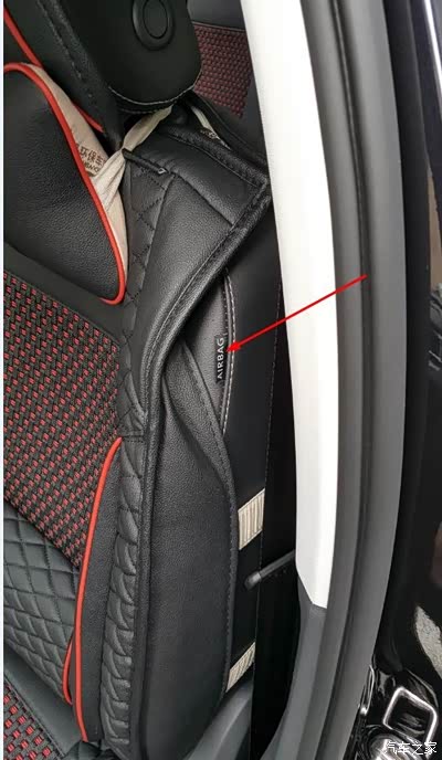 前排座椅,自己装了个坐垫套,靠背侧面有安全气囊标志,红色箭头部。