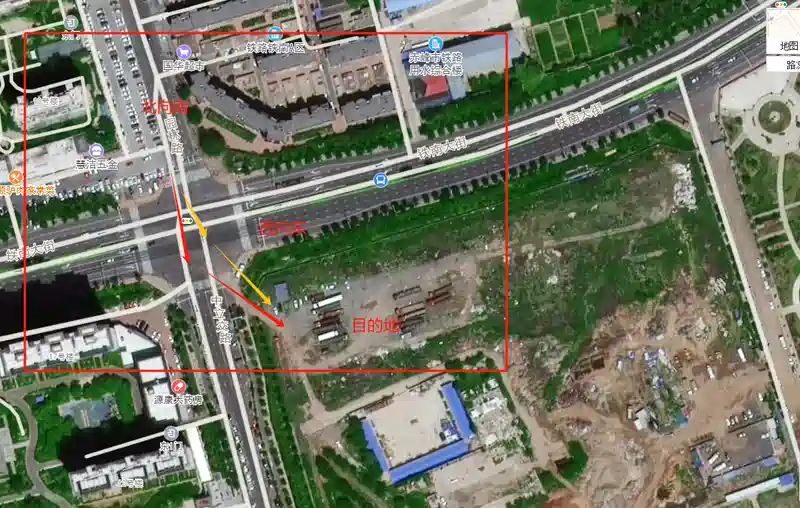 如图,我如果在园林路北向南方向去马路对面左侧的目的地,北向南方向路口三条车道,左侧向右侧分别为左转车道,直行车道,右转车道,如果我去马路对过左侧那个停车场,我是该按照红色的箭头选择直行后转向目的地还是应该按照黄色的箭头占用左转车道去往目的地呢?提示:该停车场其实是工地临时存放车辆的地方,入口不是正规的入口,就是大家走着方便压出来的入口。其他地方入口都被周边的绿化带以及铁皮封闭了。
