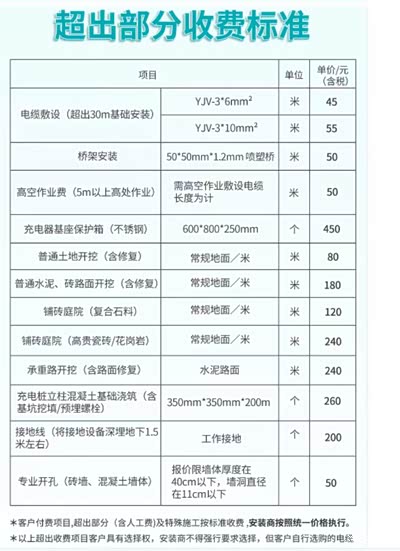 问 关于充电桩的问题 删除 推荐精华 置顶 取消置顶 关闭回复 打开回复 推荐编辑 楼主禁言 移动帖子 重置头像 操作记录 北京车友2314795 0浏览 · 2023-12-25 15:29· 发布于北京 问一下大家哦,有懂得,来帮忙分享下呢!店里面提车AION V Plus以后,充电桩都是什么时候来给装的,装充电桩还需要支付什么额外的费用吗? 举报 打开汽车之家 阅读体验更好 相关问题 更多 问新款霸王龙~~~ 0回答 问系统更新 0回答 问埃安霸王龙副驾异响 0回答 问奶爸的开学焦虑 0回答 问真实,续航多少公里 0回答 问高速上智驾无故退出! 0回答 全部回复 只看楼主 超级结巴 关禁闭 已屏蔽 app预约,一般3天内就有师傅联系上门。30米以内免费,超过30米按每米45块收费 2023-12-25 16:26 来自广西 回复 沙发 屏蔽此人 举报 删除 取消删除 禁言 重置头像 共有条对话 > 南京鑫哥 关禁闭 已屏蔽 AION V 用埃安app,私桩管理预约安装,随后会有充电桩工作人员联系您,具体车位情况,需不需要配合办理电表。只有充电桩、空开、30米之内的管线安装是免费的。以下是安装前给的消息及收费价格。 您好!群内有您的安装充电桩专属客服小管,接下来由我们来跟进您的家充桩安装,有任何疑问欢迎随时咨询。您安装权益包含的安装服务内容:1、家用充电桩7KW产品1套 (枪线为3.5米长)。2、30米内线缆材料基础安装(30米电缆线及管材实际安装长度小于套包米数的,以实际安装长度为准,差额米数不以任何形式优惠或赠送,30米以内线材规格为3*6mm²,超出规格需要升级属于增项)。3、一个漏电保护器及其安装。4、享受最多2次免费上门服务的权益(包括最多1次勘测上门及1次安装上门),请务必在师傅当天上门前提前准备好相关车架号资料原件以便现场查验。5、为您提供3年的施工质保服务。6、如安装过程中使用的线缆超出套包部分,或者涉及挖沟、开槽、打地线、穿墙打孔、防护箱等特殊施工和材料项目,我们将会根据全国统一收费标准收取相关费用。7、公司要求上门安装时候必须要现场核对车架号,麻烦提前提供行驶证原件或者汽车或者购车发票原件三选一在现场给到核实。8、您的订单自提报日起会在系统留置30天,如果未安装会自动关闭,关闭后就需要您重新下单申请的,发票日期3个月有效内及时完成安装,逾期会失效,谢谢! 2023-12-30 23:08 来自江苏 回复 板凳 屏蔽此人 举报 删除 取消删除 禁言 重置头像 共有条对话 > 还想在主楼增加内容?点击续写主楼内容 登录 参与更多互动 发表回复 打开App,查看更多评论 首 页 上一页 下一页 末 页 跳 转 取 消 还想在主楼增加内容?点击续写主楼内容 登录 参与更多互动 系统故障 发表回复 图片最多上传9张 微信好友 微信朋友圈 新浪微博 QQ好友 QQ空间 取消 相关推荐 加载中