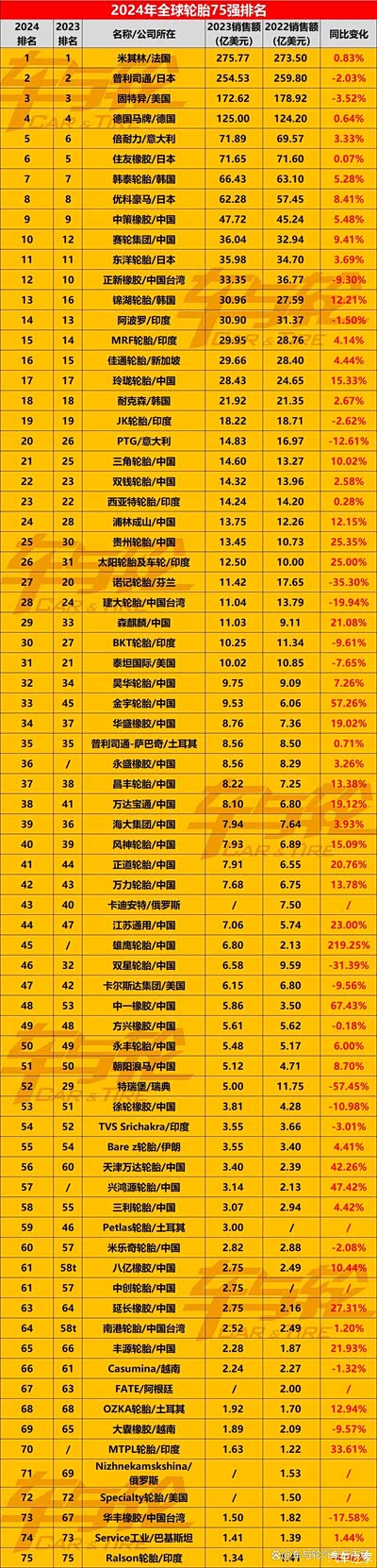 还有就是海大轮胎,四川五粮液集团的子公司,2024年全球轮胎75强排名39名,营收7.94亿美元