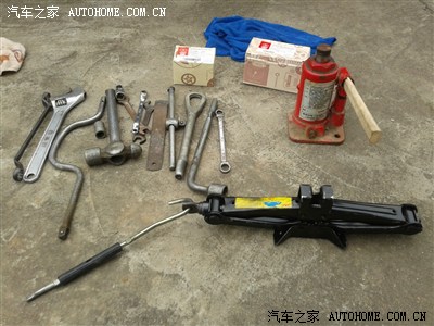 ---------准备充足的工具。因为还要顺便调换轮胎,所以要准备两个千斤顶!