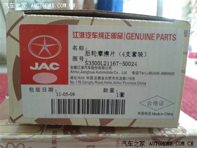下面是原厂的前后刹车片!(是在汽配城买的,前面75元,后面65元 ,工时自己搞定免费) 我不是困难户,也不是小气想省钱。而是:我是这方面的兴趣专业户,喜欢研究。非常乐意自己动手探索未知 ,就跟打发时间休闲一样的