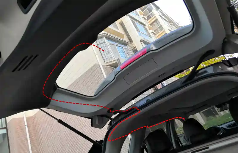 21款奇骏(2.0排量)后挡风装独立的行车记录,电源线怎么走线?我的初步设想是按照图中虚线走线,问题有两个:一是电源线、线如何穿过这个套管(见图)?是拆下顶部饰板吗?二是,穿过套管后如何将线穿过后盖内部的灰色内饰板。