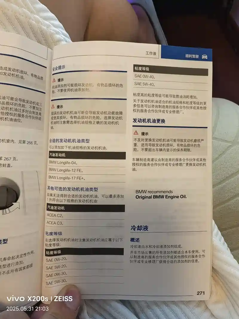 国六的高功率,但是却不带gpf颗粒捕捉器,我一直在4s里面买保险,所以一直用的买保险送的小保养,加的机油就是图里面的那种5w30原厂机油 (不带gpf标准,非低灰分机油),现在准备不在4s店做保养了,请问一下大家我这种请款现在选世面上哪款机油最合适。我看自带的说明书上写的又是要求宝马longlife 4认证,但是这个认证的机油基本上就是低灰分的机油,我一直使用这个5w30使用的是long-life 01的认证,但是市面上有这个认证的比如嘉实多极护却是5w40的机油,现在我就有点不知道到底选哪个牌子哪个系列的哪个型号的机油最合适了,请大家帮忙推荐一下,谢谢。