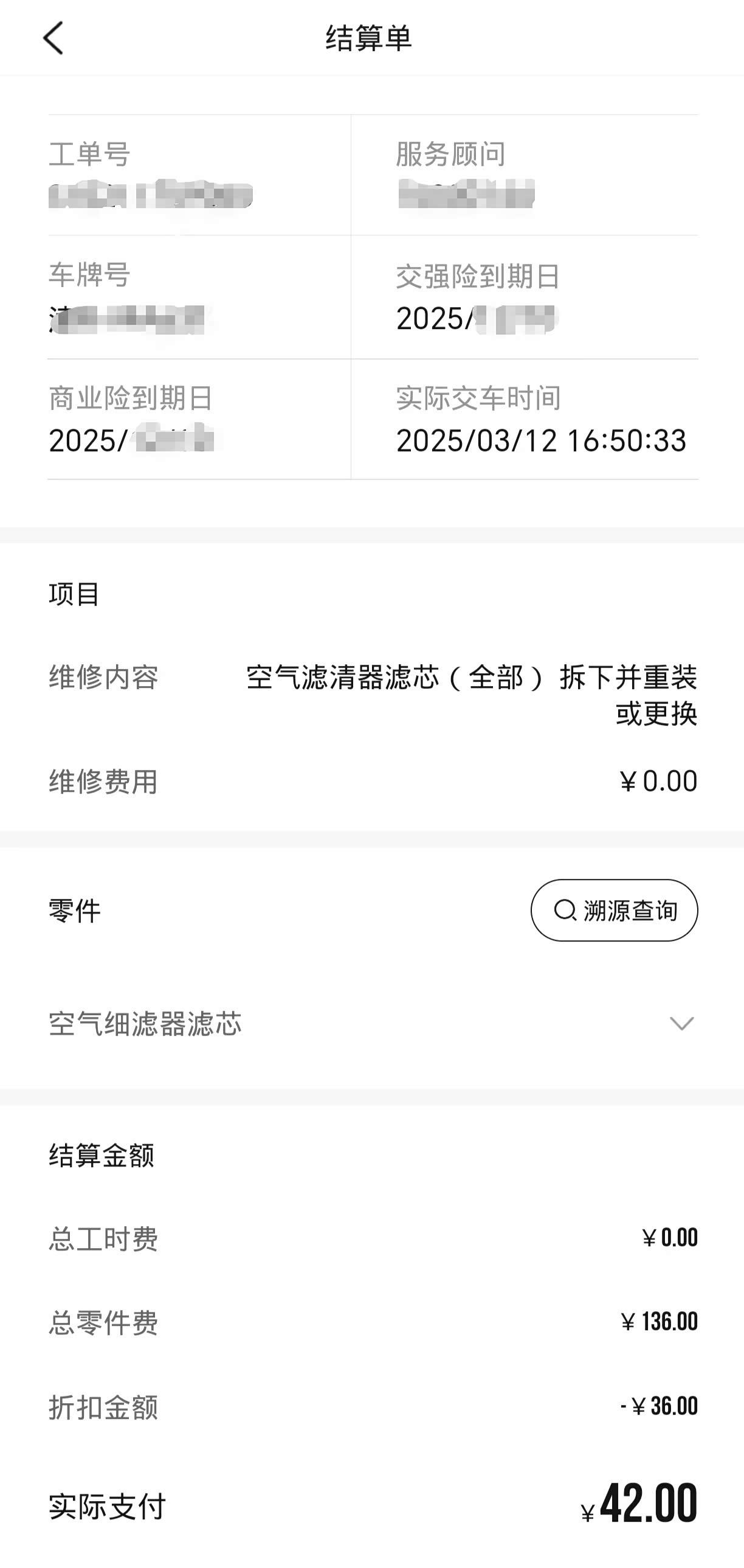 新车刚一年,在翻app功能的时候,无意中发现了一条维修记录:时间是跟5000公里的首检是一个时间,应该就是首检的时候发生的,维修内容是空气细滤器滤芯更换,而且显示更换了两个。