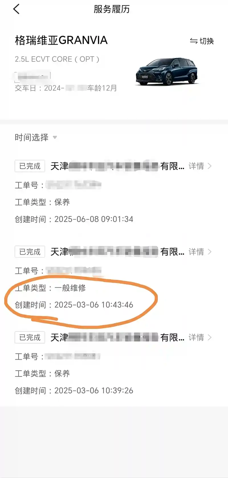 3、服务时间显示是跟首检一起的3.6号,但交车时间又显示的3.12号,我只在3.6号去做过首检,首检完当时就收车回去了,12号不可能还存在交车的情况。